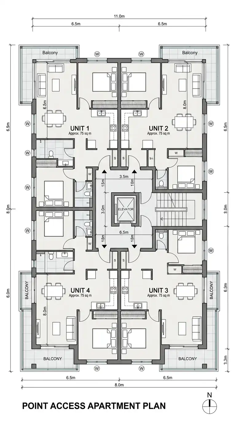 The point access apartment has a central stair and elevator core, with 2-4 units per floor arranged around the core. Each unit has windows on two or three sides. There is no long corridor — each unit opens directly off the core. This plan is efficient and provides excellent light and ventilation.