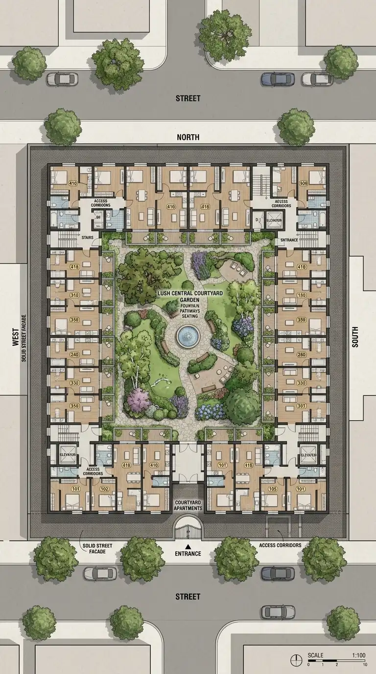 The courtyard apartment wraps units around a central courtyard. The courtyard provides light, air, outdoor space, and a sense of community. The building presents a solid face to the street, with the courtyard hidden inside. Units have windows facing the courtyard and sometimes the street.