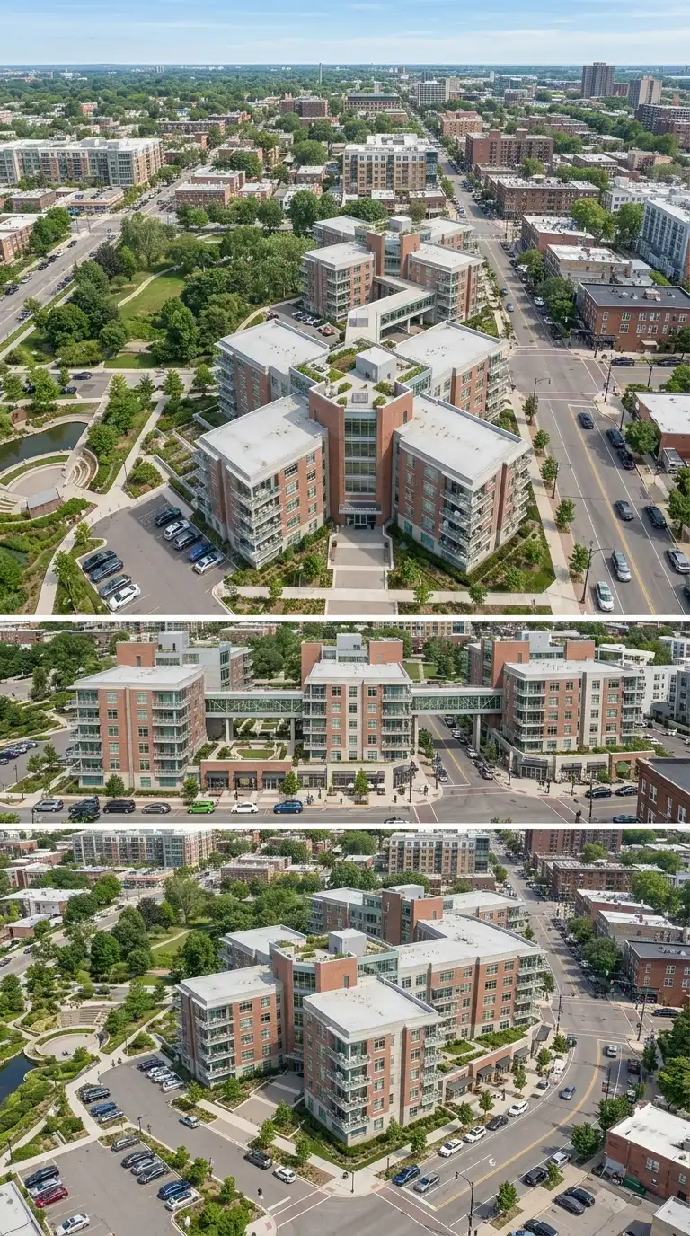This design is ideal for urban infill and transit-oriented development. The emotional effect is urban, lively, and diverse.