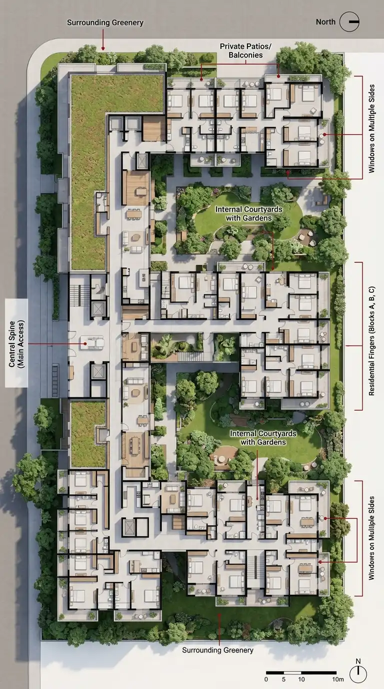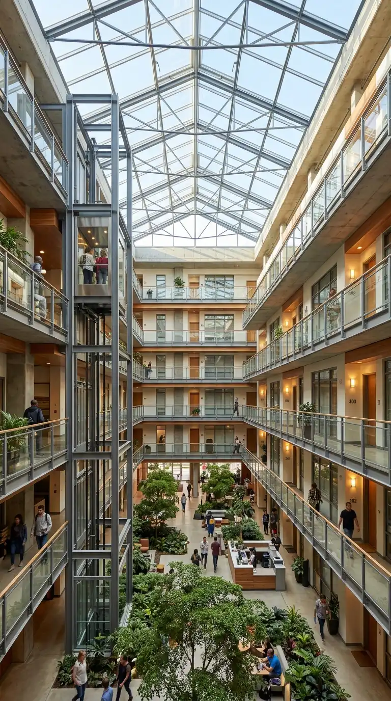 The atrium apartment has a large central space open to the sky, surrounded by units on multiple levels. The atrium is the heart of the building — a shared garden, a gathering space, a source of light. Units have windows facing the atrium and sometimes the exterior.