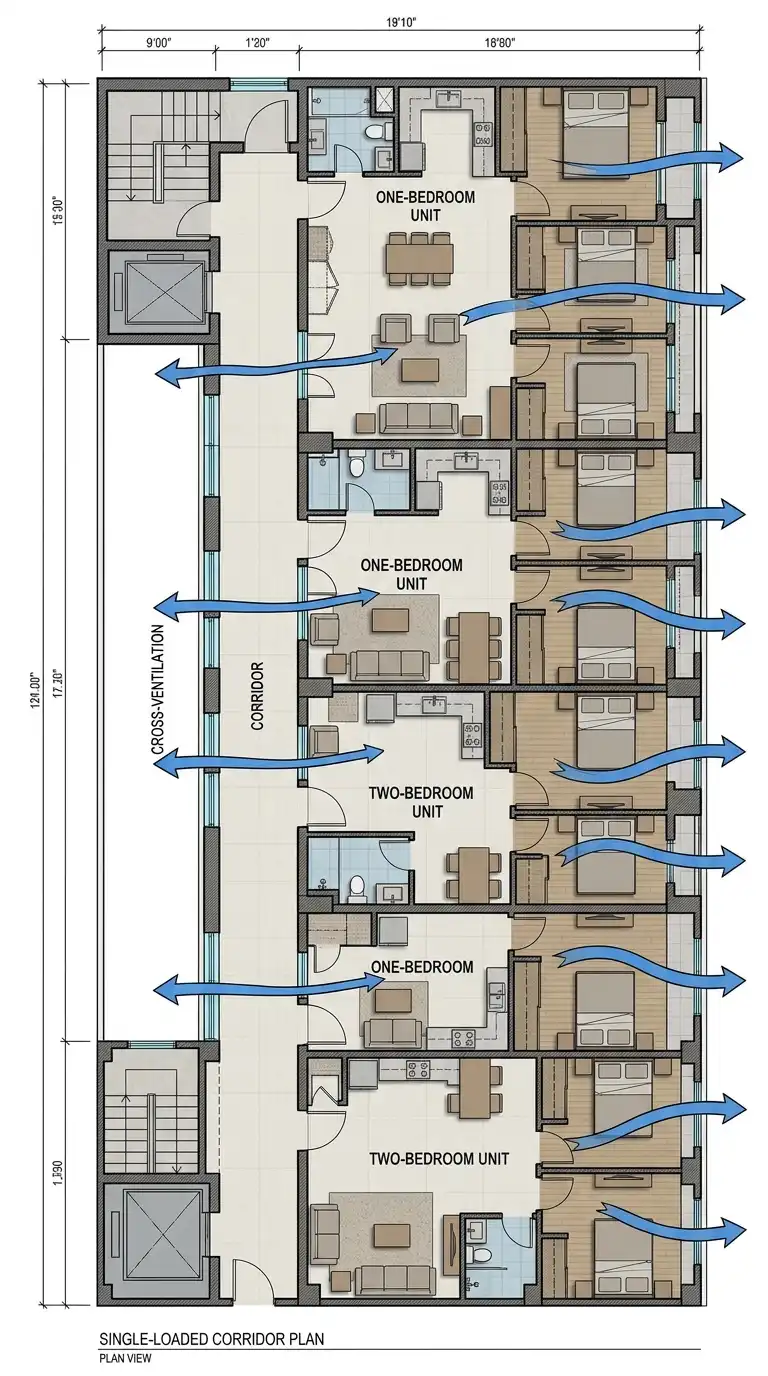 The single-loaded corridor apartment has a corridor on one side of the units, with windows on the opposite exterior wall. Every unit has windows on two sides (exterior and corridor), and the corridor also has windows. Cross-ventilation is possible. This plan is less efficient than double-loaded but provides better light, air, and privacy.