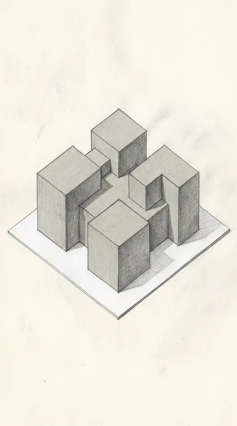 The cardboard massing model is the most basic and essential architectural model. It is made from grey or white museum board, cut with a sharp knife and assembled with PVA glue. The model shows only form and mass — no windows, no materials, no details.