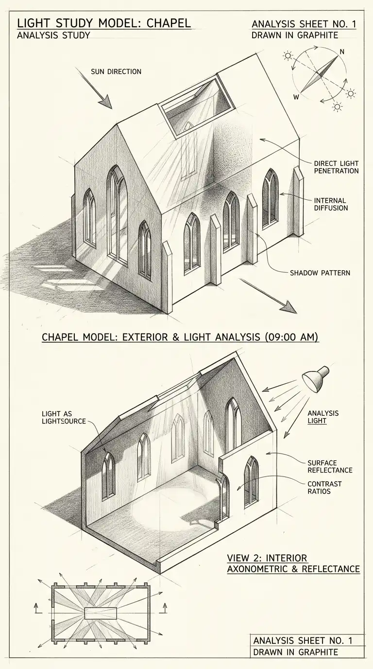 The light study model is designed to be photographed under different lighting conditions. The model is white, with openings cut for windows and skylights. It is placed in a light box or under a single light source. Photographs show how light moves through the spaces.