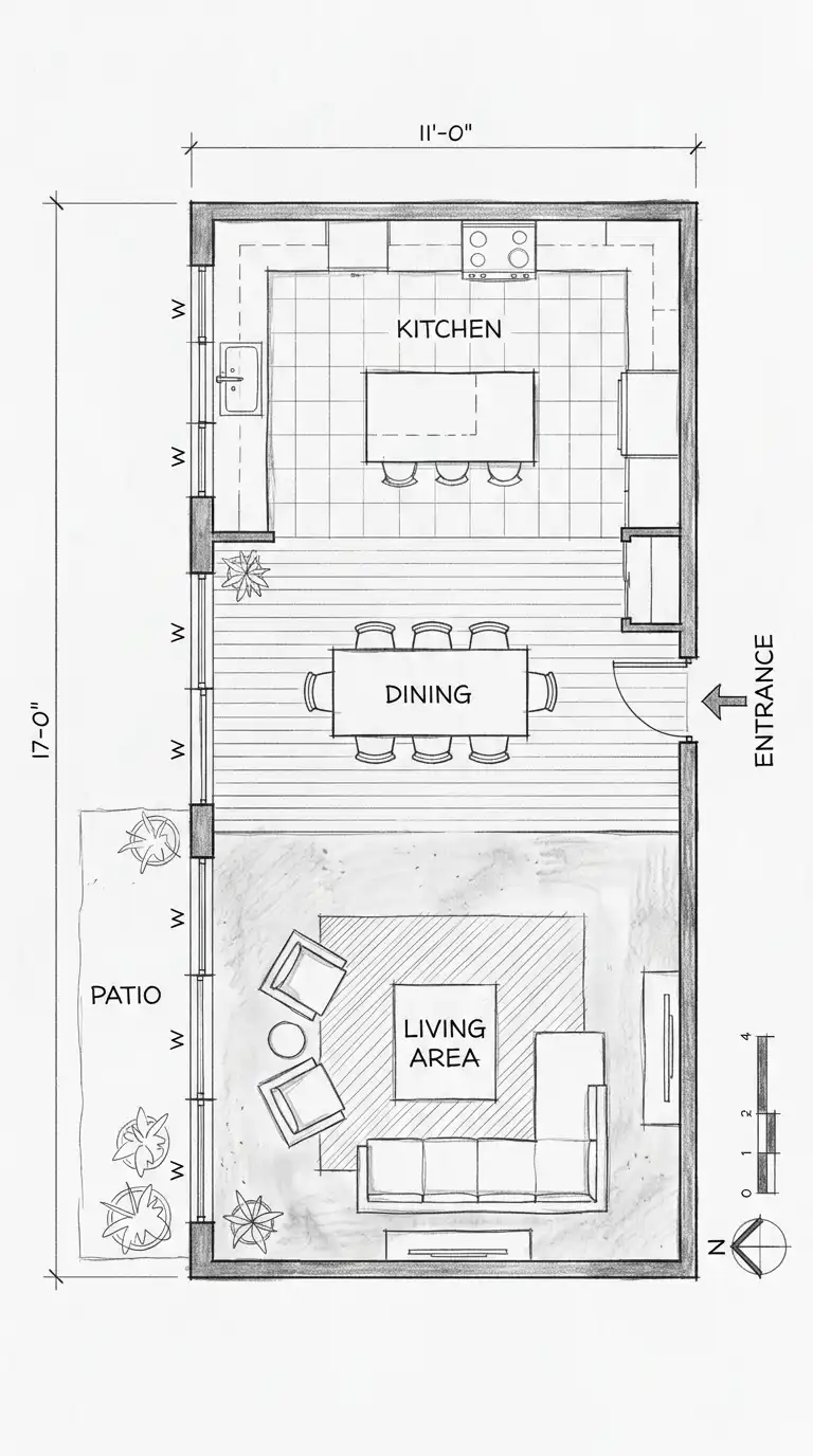 This plan is ideal for apartments, lofts, and modern houses. The emotional effect is spacious, flexible, and social.