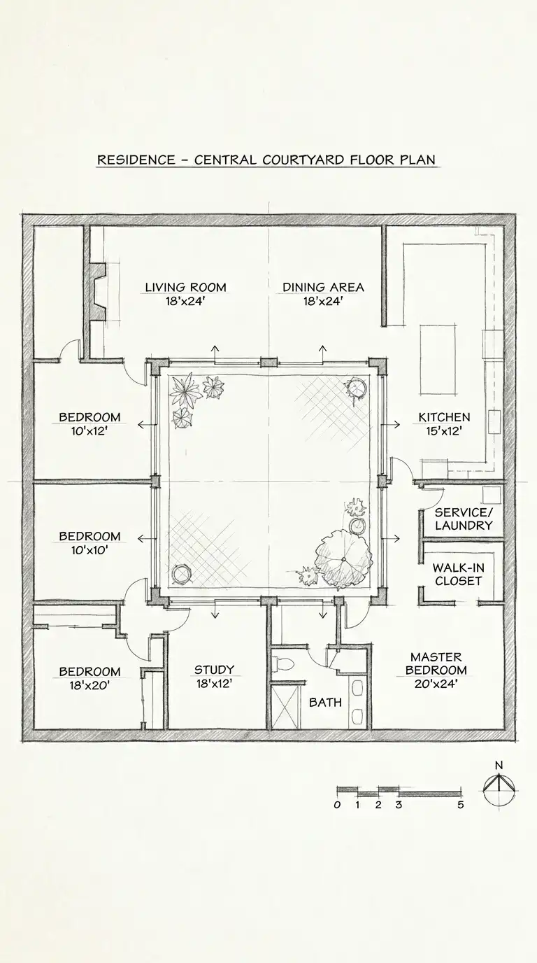 The central courtyard plan wraps rooms around an open centre. The exterior walls are solid and private. The interior opens entirely to the courtyard. All major rooms face the courtyard.