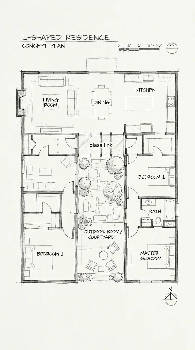 The L-shaped plan has two wings meeting at a corner. The inside corner becomes a sheltered outdoor room. The exterior corners reach into the site. One wing contains public functions (living, kitchen, dining). The other wing contains private functions (bedrooms, bathrooms).