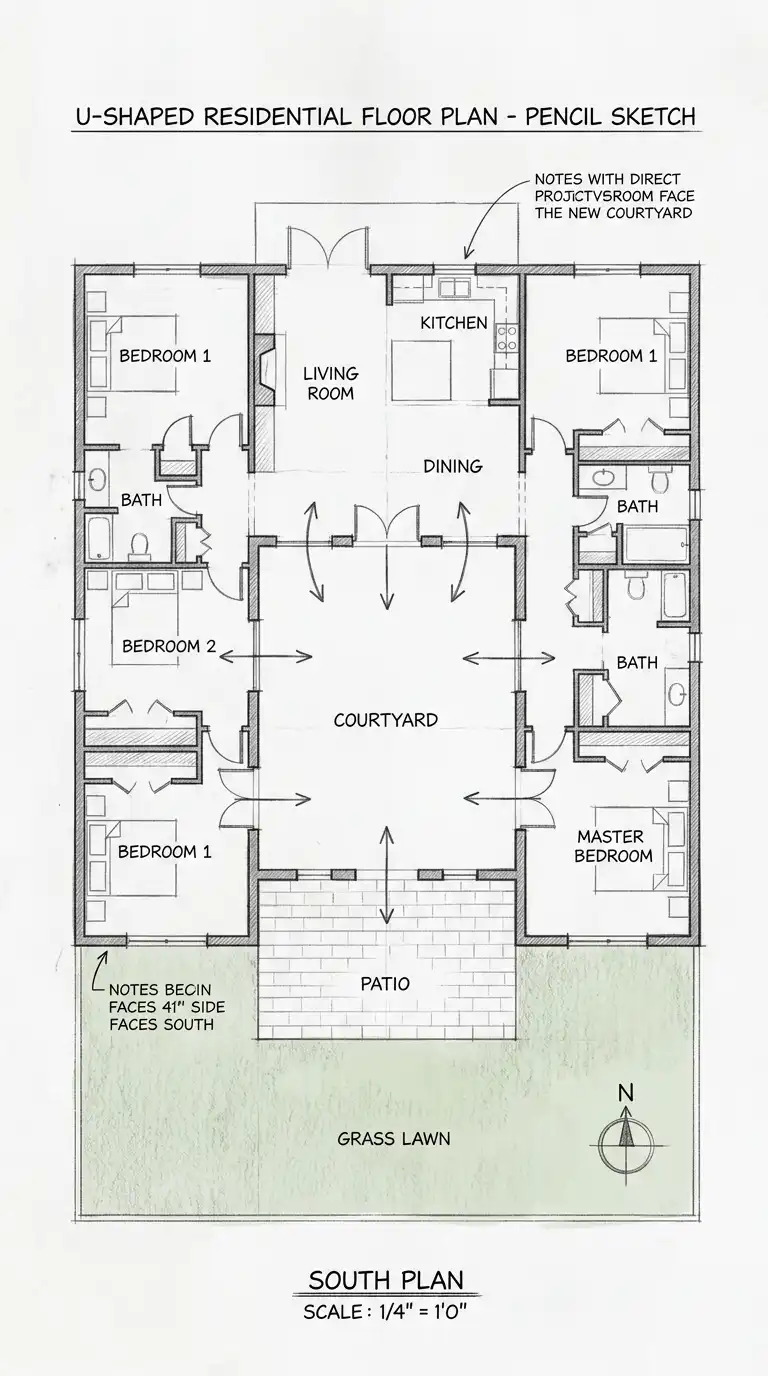 The U-shaped plan has three wings forming a U around a central courtyard. The courtyard is enclosed on three sides, open on the fourth. This configuration provides even more privacy and shelter than the L-shape.