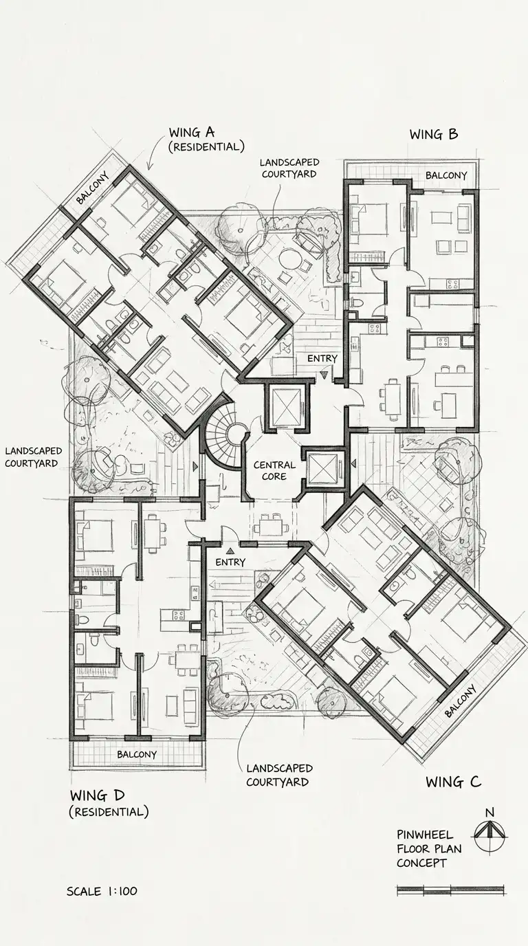 The pinwheel plan has wings radiating from a central core like the blades of a pinwheel. Each wing is rotated slightly from the next. The central core contains vertical circulation and shared amenities. The gaps between wings become courtyards or gardens.