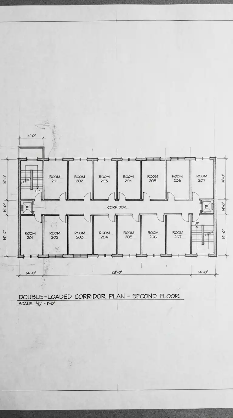The double-loaded corridor plan has a central corridor running the length of the building, with rooms on both sides. Every room has a window on the exterior. The corridor provides access and separation.