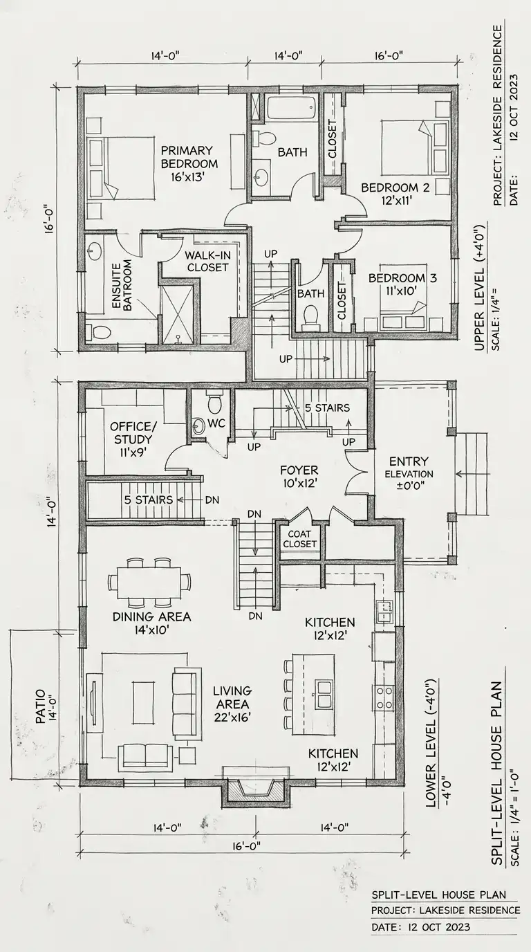 The split-level plan has floors at half-storey increments. The entry is at the middle level. Living spaces are half a storey down. Bedrooms are half a storey up. The plan follows a sloping site or creates interior interest on a flat site.