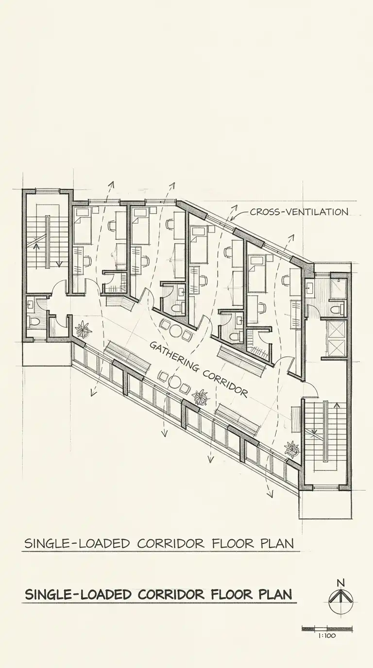 The single-loaded corridor plan has a corridor on one side of the rooms, with the other side open to the exterior. All rooms have windows, and the corridor also has windows. The plan is less efficient than double-loaded but provides better light and ventilation.