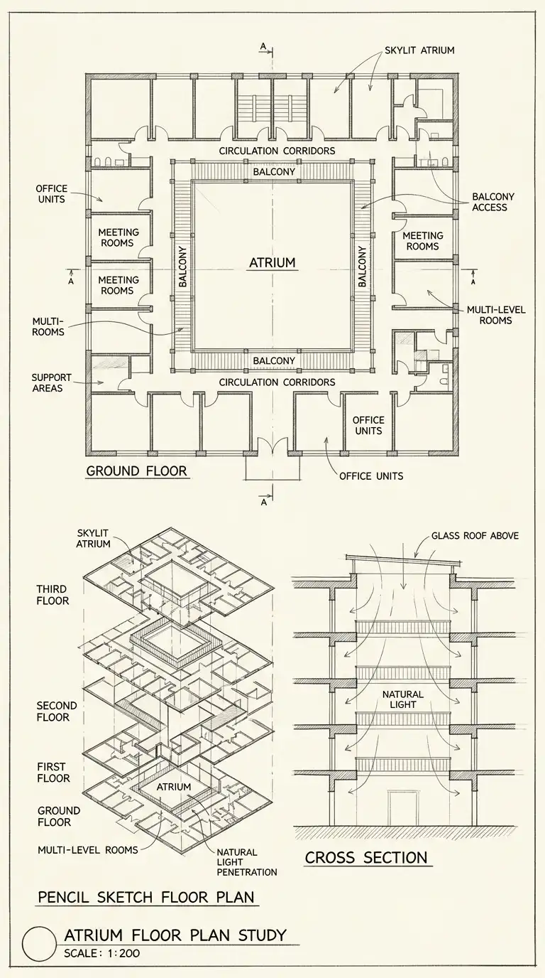 The atrium plan has a large central space open to the sky, surrounded by smaller rooms on multiple levels. The atrium is the heart of the building — a vertical courtyard. Light enters from above and filters down to all levels.