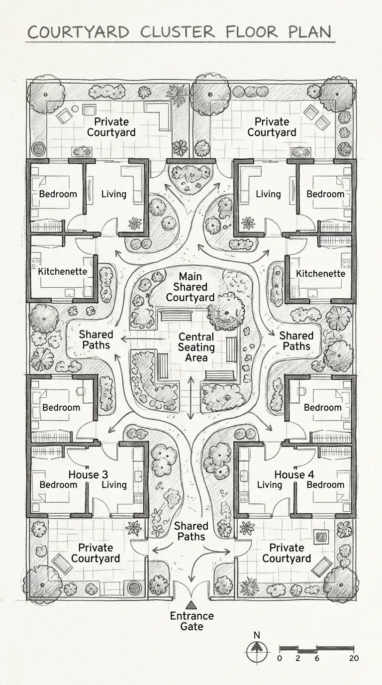 The courtyard cluster plan places multiple small courtyard houses around a shared communal courtyard. Each house has its own private courtyard. All houses share a larger communal garden. This plan combines privacy with community.