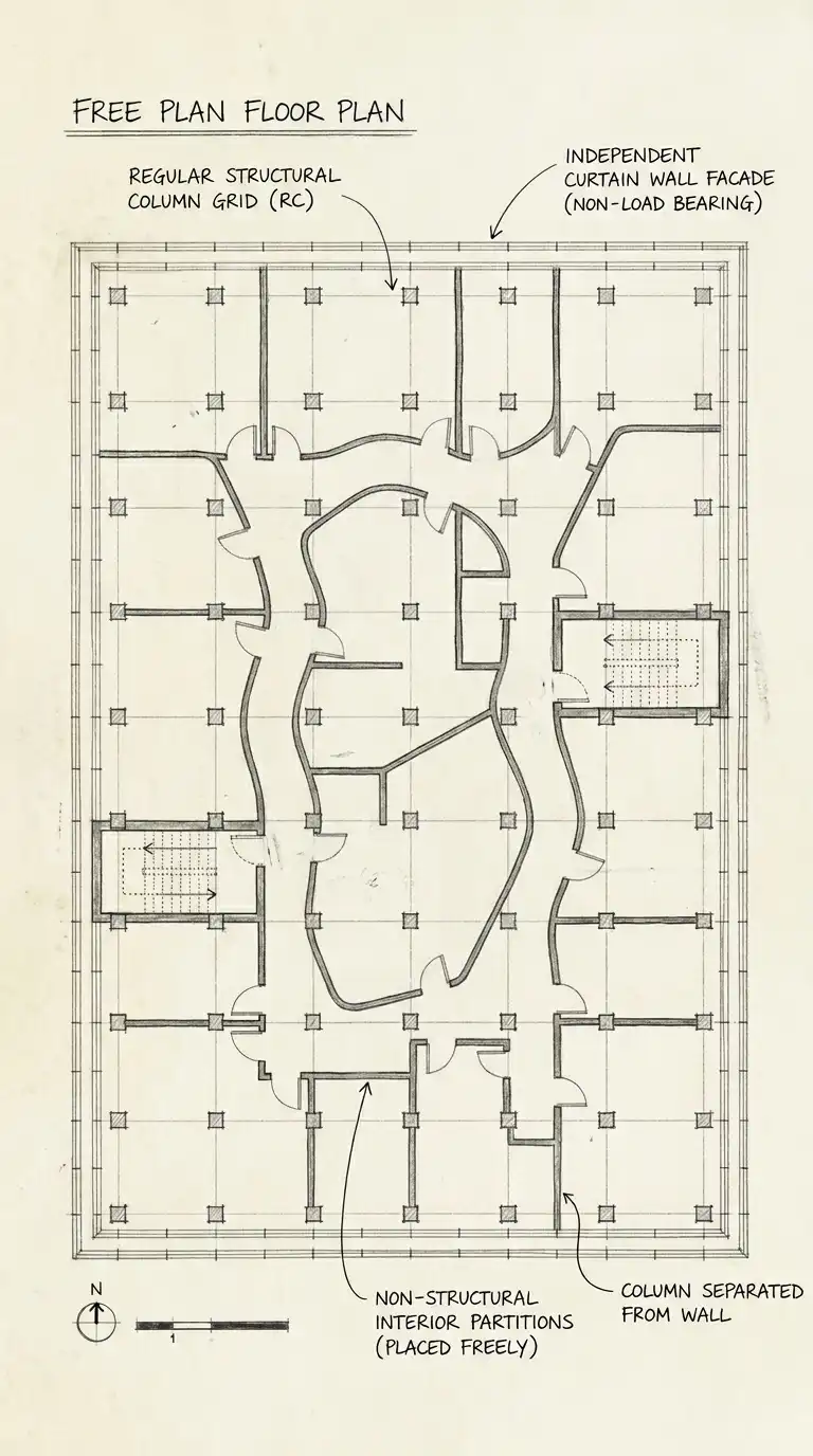 The free plan, developed by Le Corbusier, has interior walls arranged independently of the structure. The structure is a grid of columns. The interior walls can be placed anywhere, or moved later. The plan is flexible and adaptable.