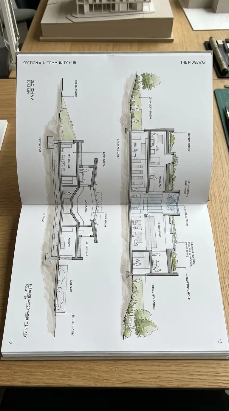 This layout is ideal for wide drawings (sections, elevations, panoramas) and hero images. The emotional effect is panoramic, continuous, and dramatic.