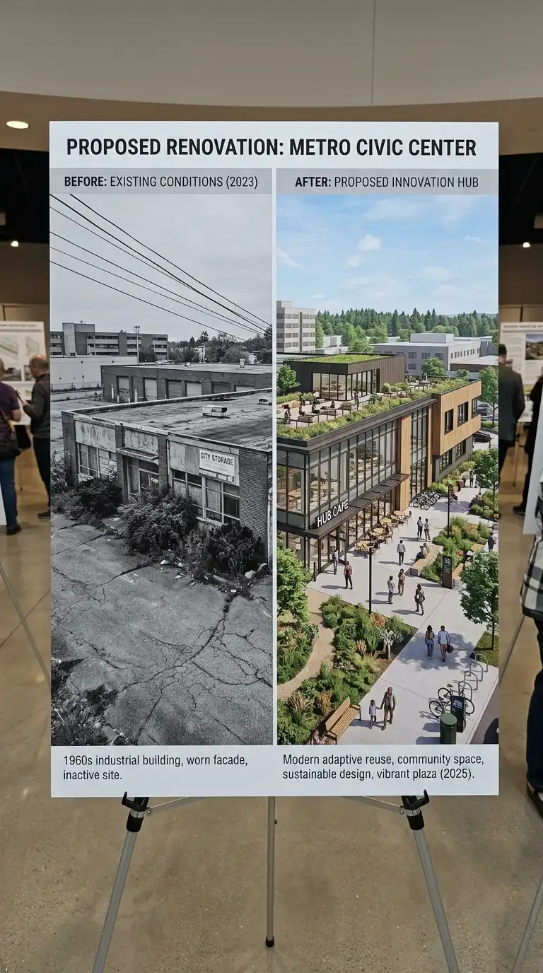 The before-and-after board shows the existing site or building alongside the proposed design. The two images are the same scale, same orientation, and same viewpoint. The comparison is direct and powerful.