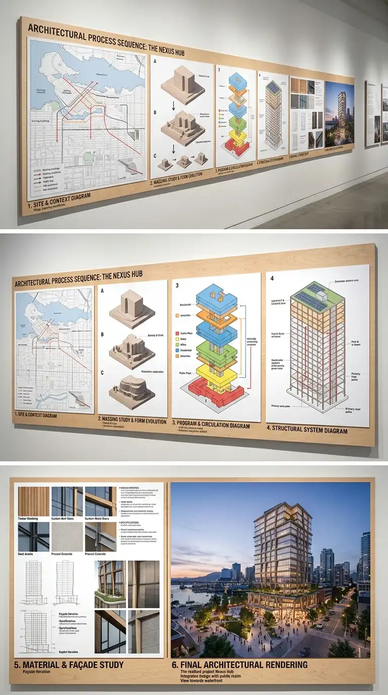 The process sequence board shows the design evolving over time. A series of diagrams, sketches, or models shows the project from first concept to final design. The sequence might have 3-10 steps.