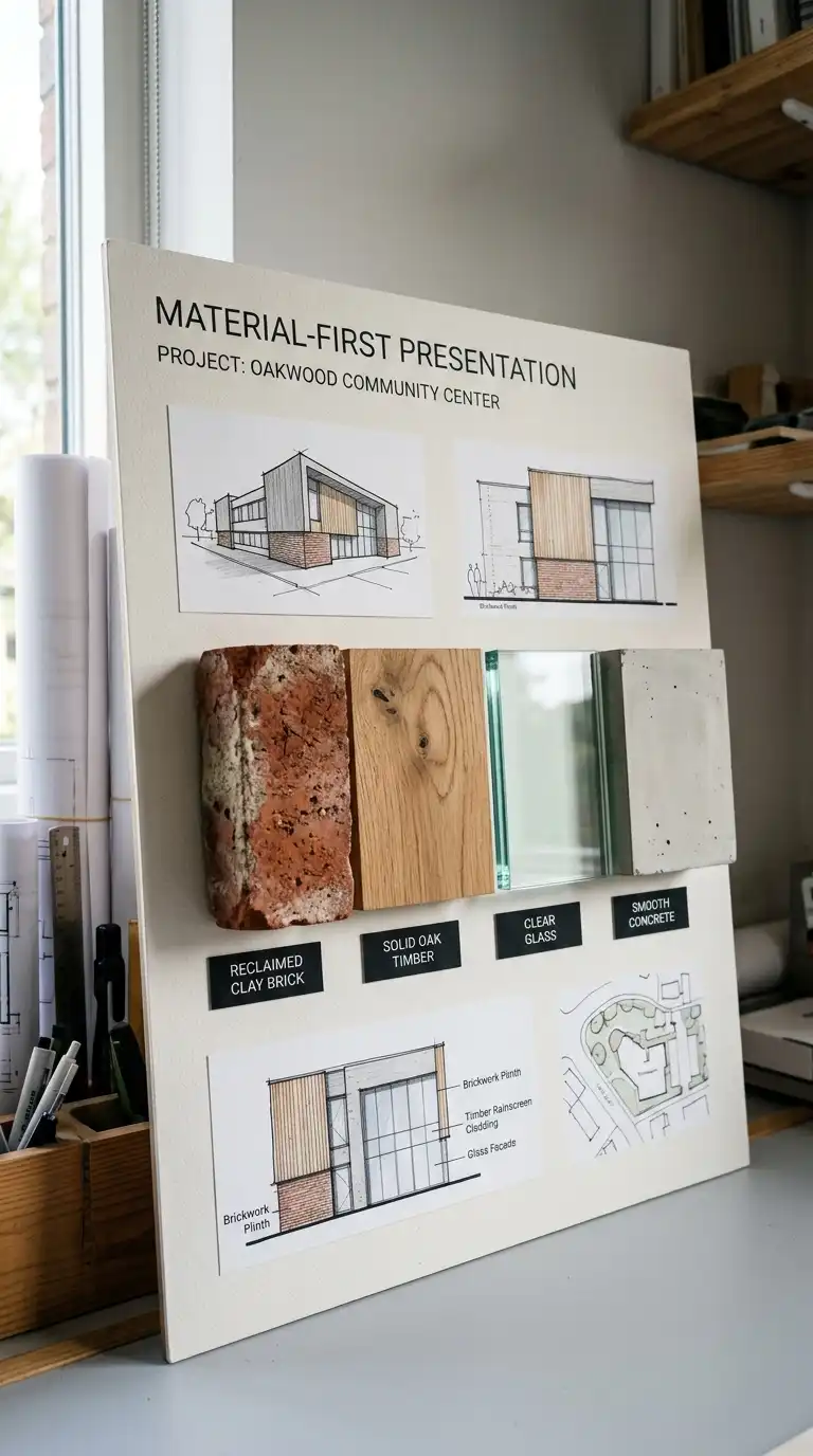 The material-first board prioritises material samples over drawings. The board includes actual samples of stone, wood, concrete, glass, and metal. The samples are arranged in a composition that reflects the building’s material strategy. Drawings are secondary — small and in the background.