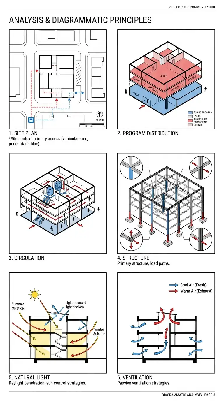 The diagram-only board uses no renderings, no photographs, no material samples. Only diagrams. The diagrams explain the building’s organisation: program, circulation, structure, light, ventilation, site. Each diagram is simple, graphic, and colour-coded.