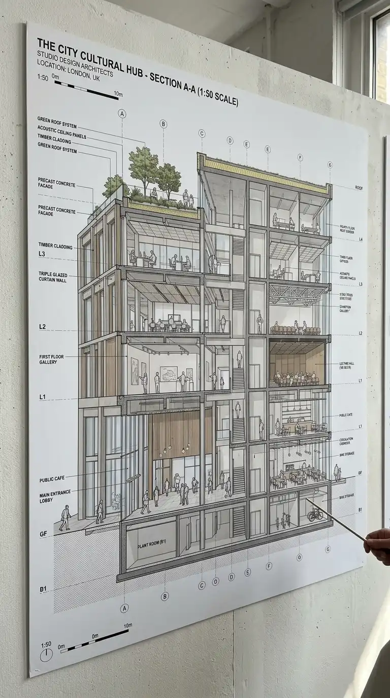 The large-scale section board uses a single section drawing at a very large scale. The section is printed at 1:50 or 1:20, covering most of the board. The drawing shows structure, material, program, and human figures at the same scale.