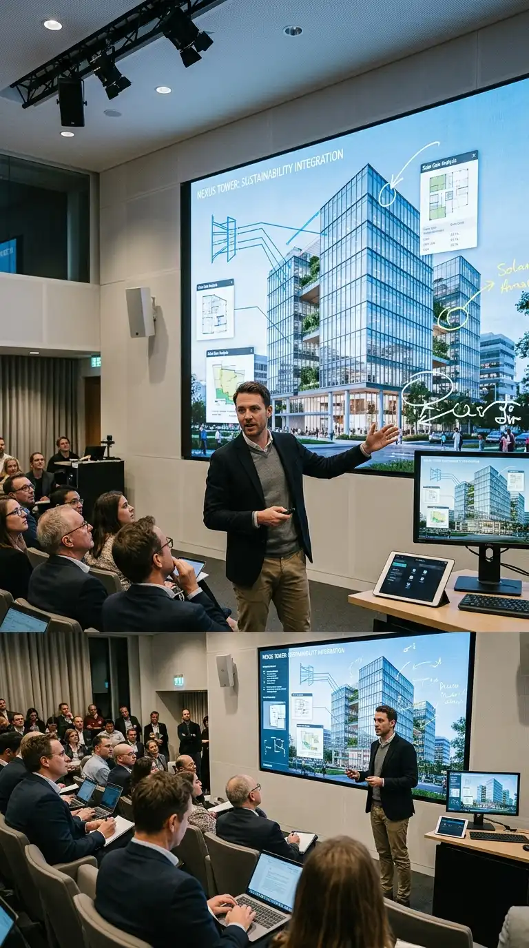 The digital interactive board uses a screen to show a dynamic presentation. The presenter controls the sequence: zooming into details, switching between drawings, overlaying diagrams on renderings. The presentation is a performance.