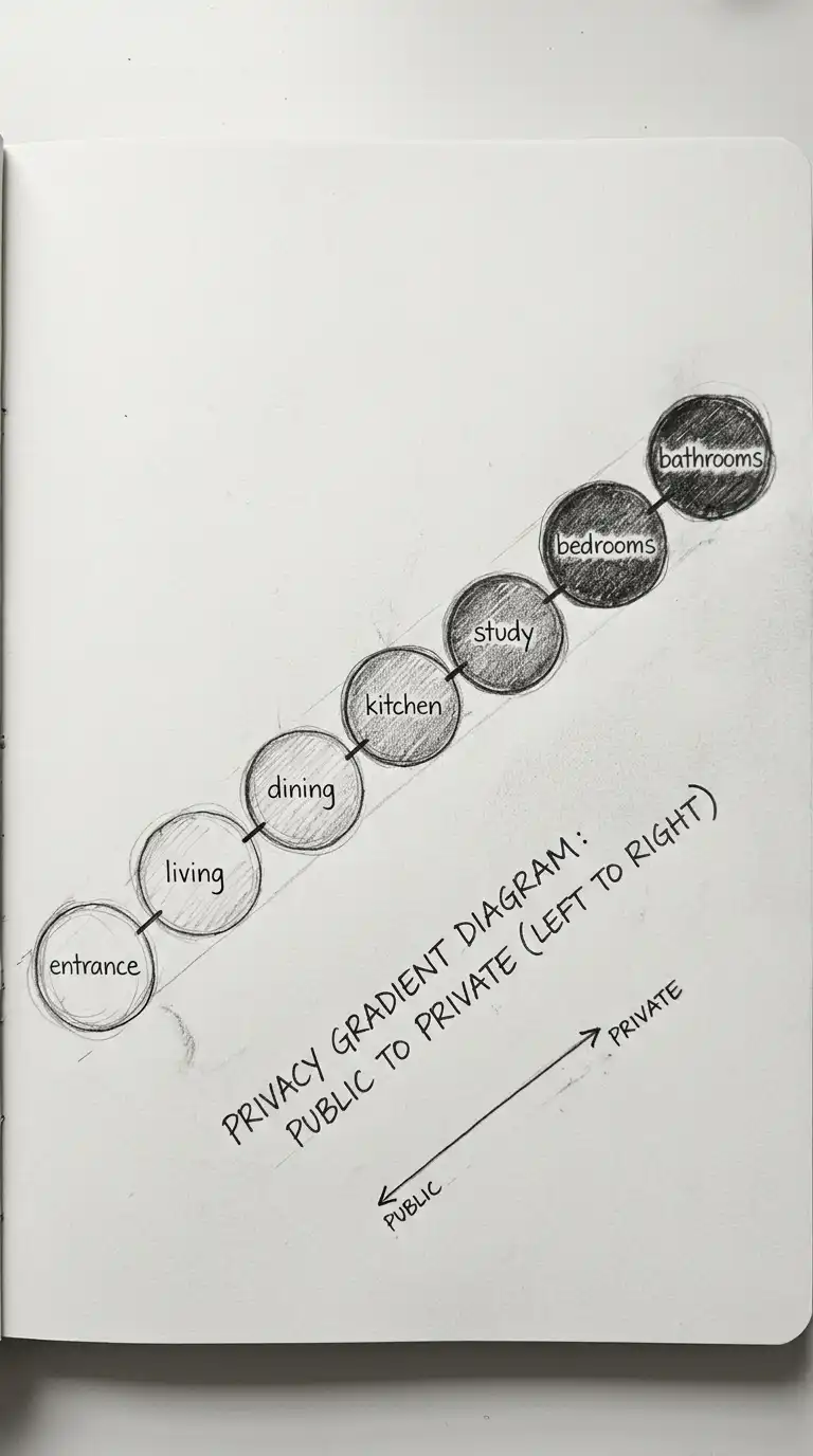 The privacy gradient bubble diagram arranges spaces along a spectrum from public to private. Public bubbles (entrance, living, dining) are at one end. Private bubbles (bedrooms, bathrooms) are at the other. Semi-public bubbles (kitchen, study) are in the middle.