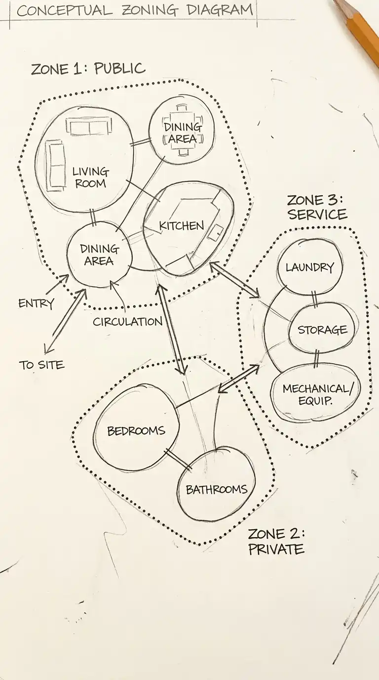 The zoning bubble diagram groups bubbles into zones. A residential zone might contain living, dining, kitchen. A sleeping zone might contain bedrooms, bathrooms. A service zone might contain laundry, mechanical, storage.