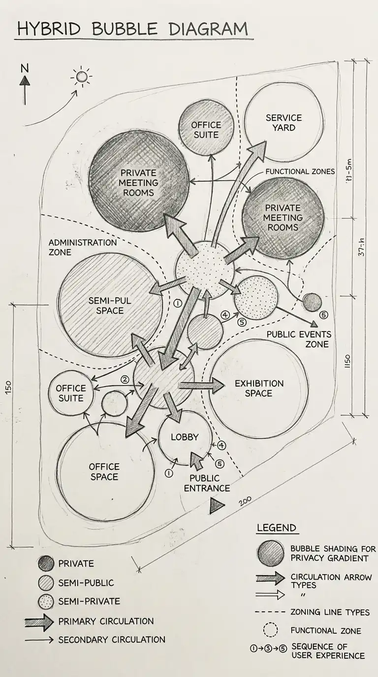 These 12 bubble diagram types are not mutually exclusive. A hybrid diagram can combine adjacency, circulation, privacy, and zoning. A sequence diagram can include light and view requirements. The best bubble diagrams are not the most beautiful — they are the most informative. They answer the questions that matter before a single wall is drawn.