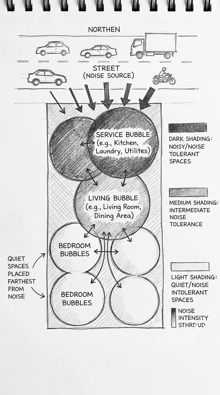 The noise and privacy bubble diagram places bubbles in relation to noise sources. Bubbles that need quiet are placed away from noise. Bubbles that can tolerate noise are placed near noise sources.