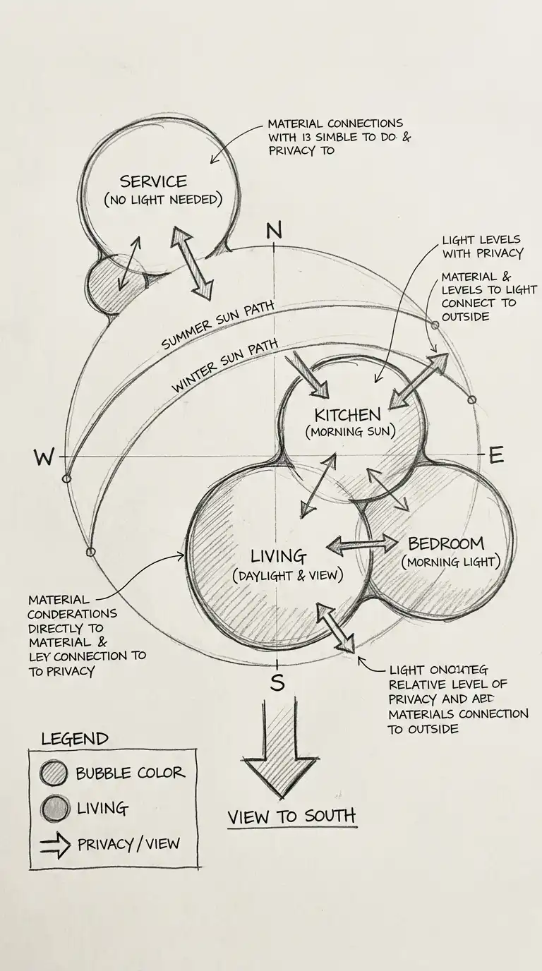 This diagram answers: which spaces need light? Which spaces need views? The emotional effect is environmental, site-responsive, and climatically intelligent.