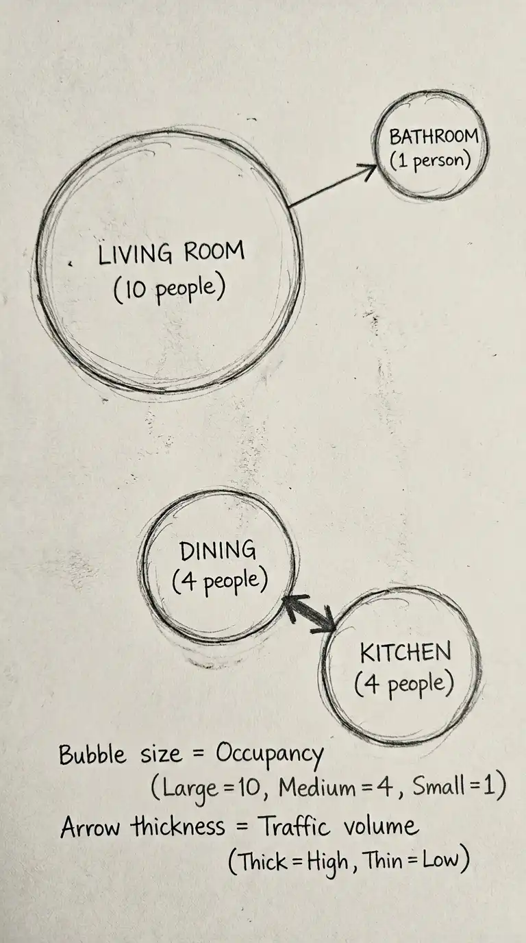 This diagram answers: how do people move through this building? Where are the bottlenecks? The emotional effect is dynamic, directional, and flow-oriented.