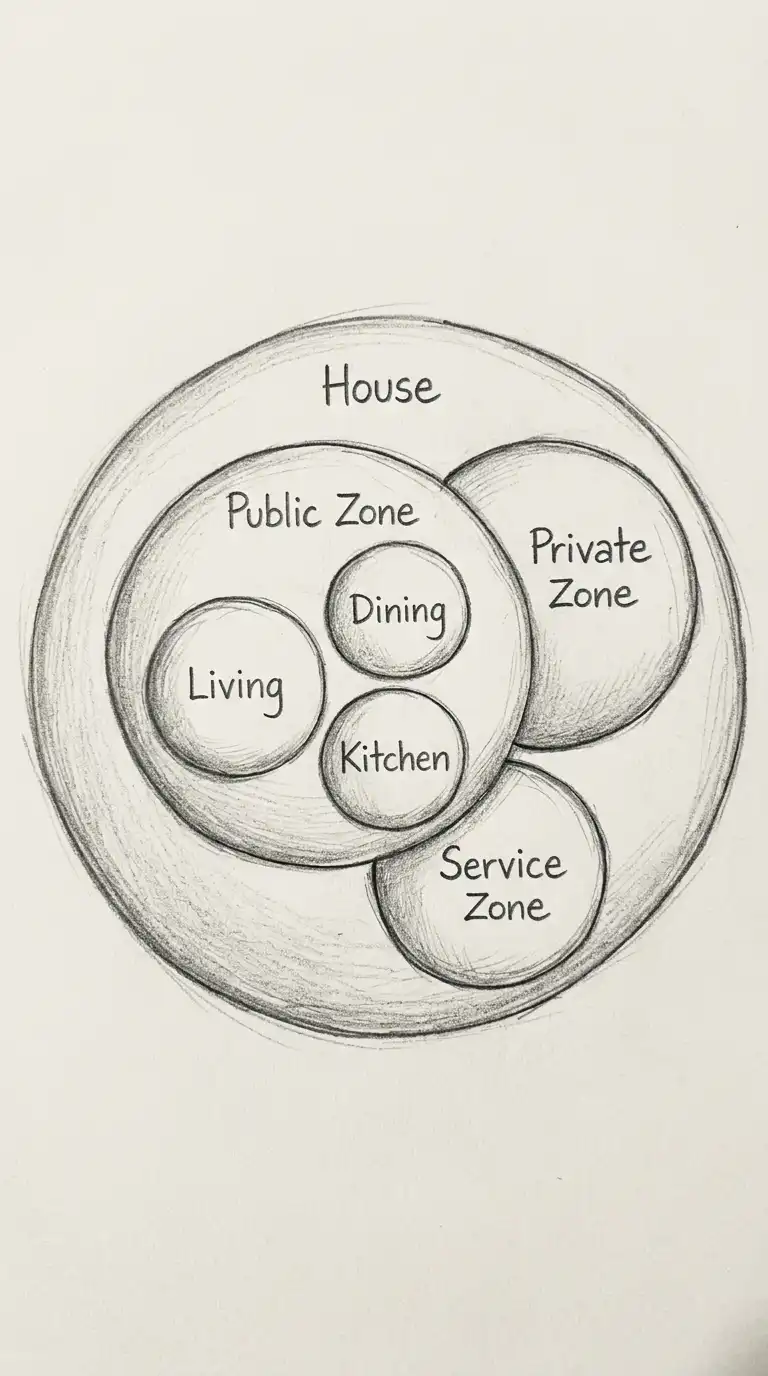This diagram is the first step in any design process. It translates the client’s program into spatial relationships. A kitchen bubble connects to a dining bubble. A bedroom bubble does not connect to a living room bubble. The emotional effect is logical, clear, and programmatically intelligent.