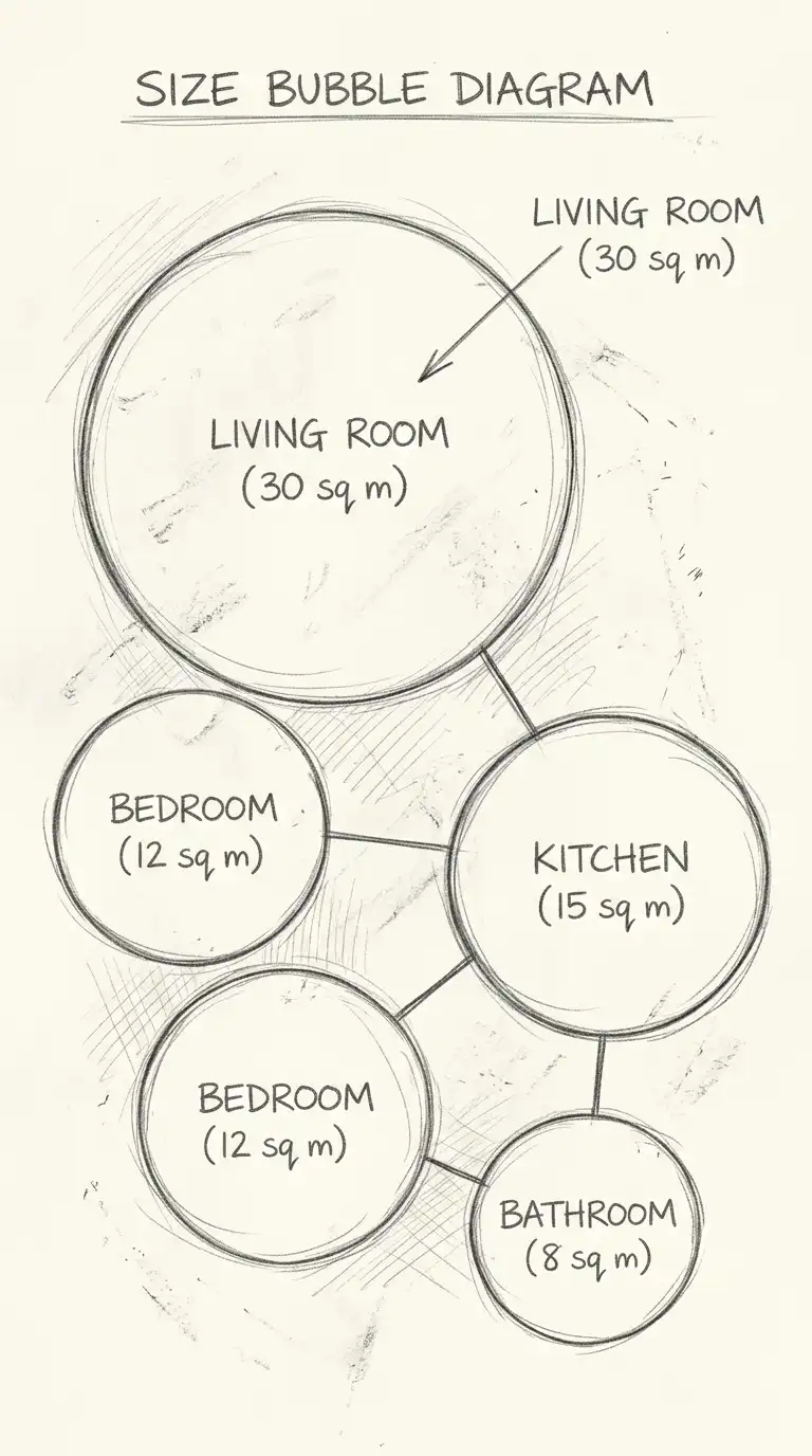 The size bubble diagram uses bubble area to represent room area proportionally. A living room bubble (30 square metres) is three times larger than a bathroom bubble (10 square metres). This diagram adds quantitative information to the qualitative adjacency diagram.