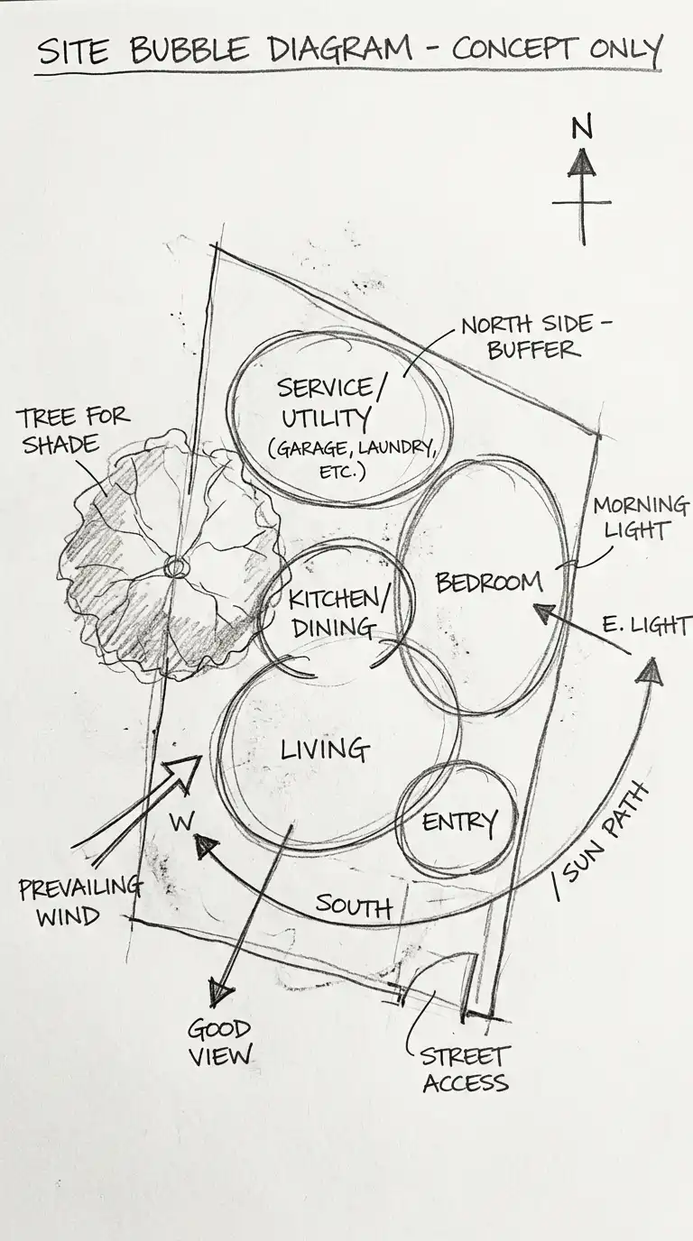 The bubble diagram is the most underrated tool in architecture. It is not a drawing. It is not a plan. It is a way of thinking. A bubble diagram forces you to ask: what spaces need to be near each other? What spaces need to be separate? How do people move? Where does the sun come from? Where is the noise?