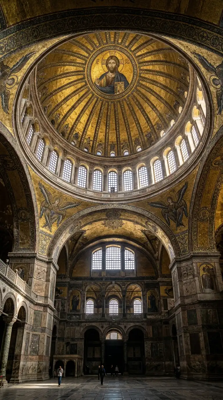 Hagia Sophia (537 CE) in Istanbul is the masterpiece of Byzantine architecture. It has a massive dome on pendentives. The dome seems to float. The interior is filled with golden light. The dome is 55 metres high and 31 metres wide. Hagia Sophia is domed, floating, and golden.