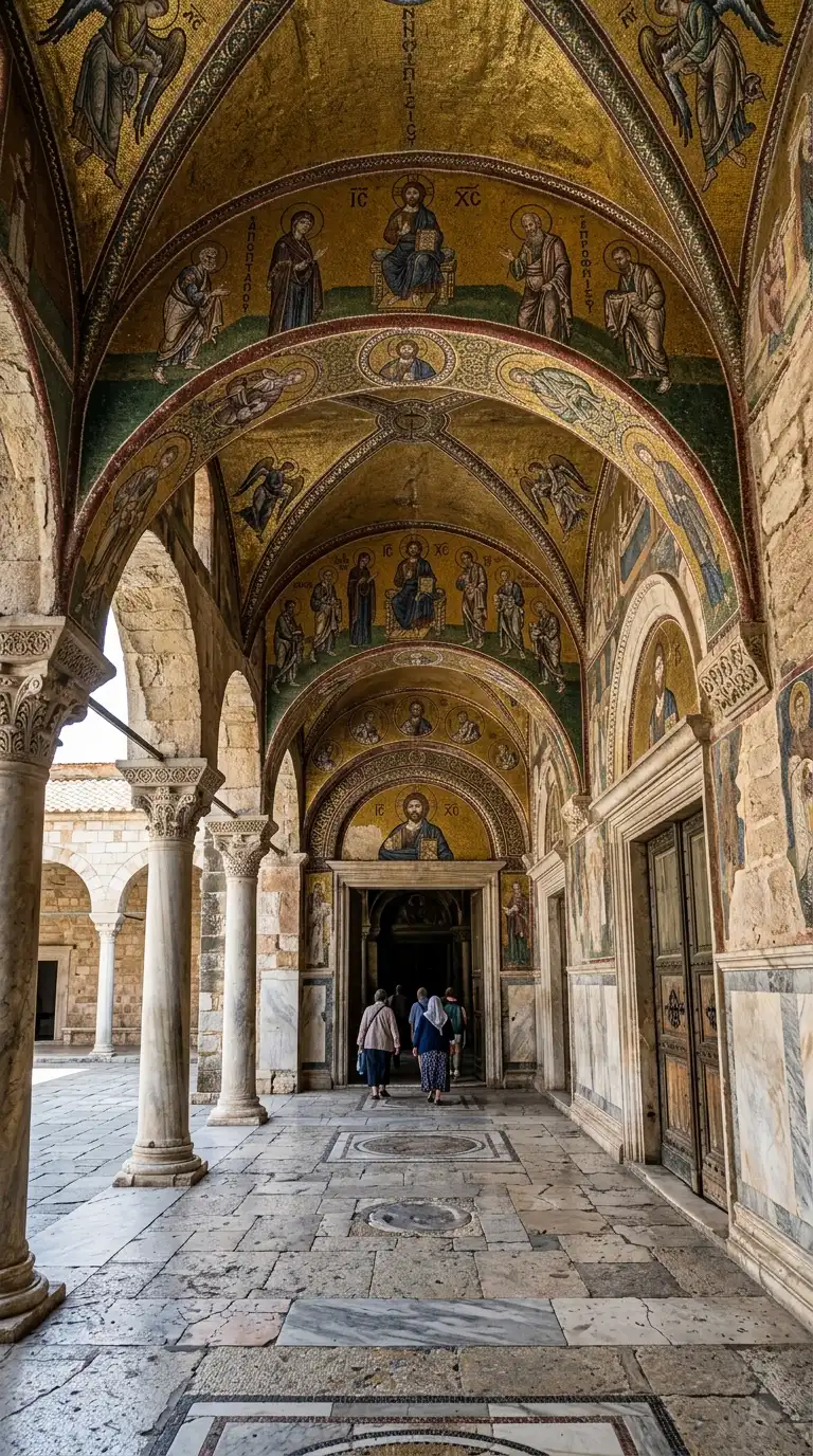 The narthex is an entrance porch at the west end of a Byzantine church. The narthex is a transition space — from the world into the church. The narthex is often decorated with mosaics of the Second Coming. The narthex is transitional, preparatory, and mosaic-decorated.