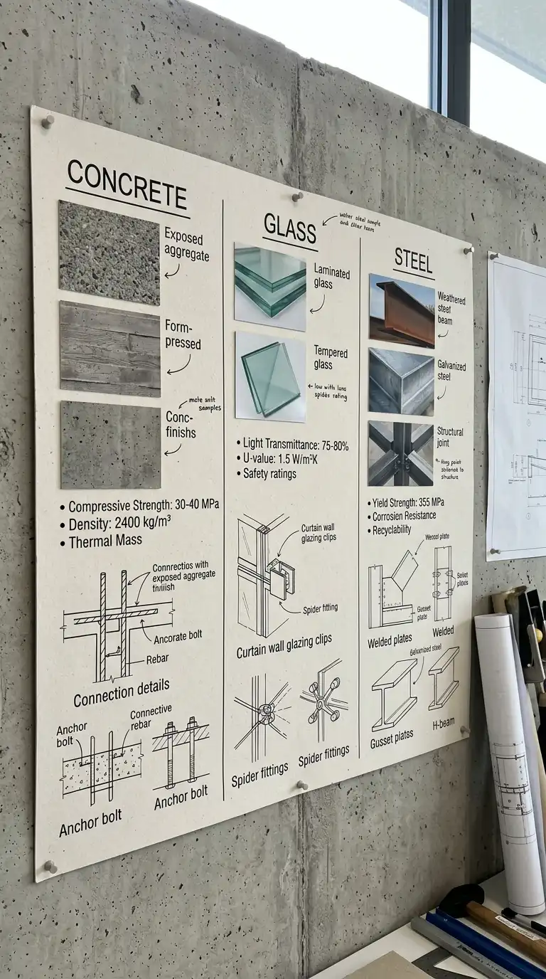 The material analysis sheet focuses on what the building is made of. Photographs or drawings of materials are arranged. Material properties are noted (colour, texture, durability). Material connections are detailed. The material analysis sheet is material, tactile, and detailed.