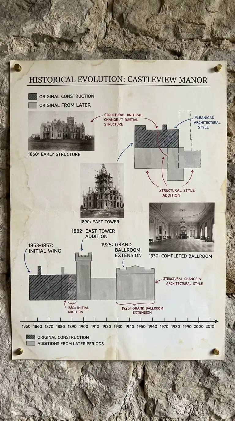 The historical analysis sheet focuses on the building’s history. A timeline shows key dates. Historical photographs or drawings are included. Original construction and later additions are distinguished. The historical analysis sheet is historical, chronological, and layered.