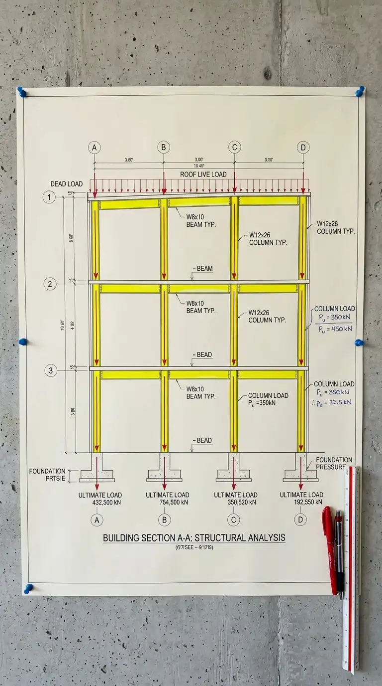 The structural analysis sheet focuses on how the building stands up. The plan or section is the base. Columns, beams, and load-bearing walls are highlighted. Load paths are shown with arrows. The structural analysis sheet is structural, load-focused, and tectonic.