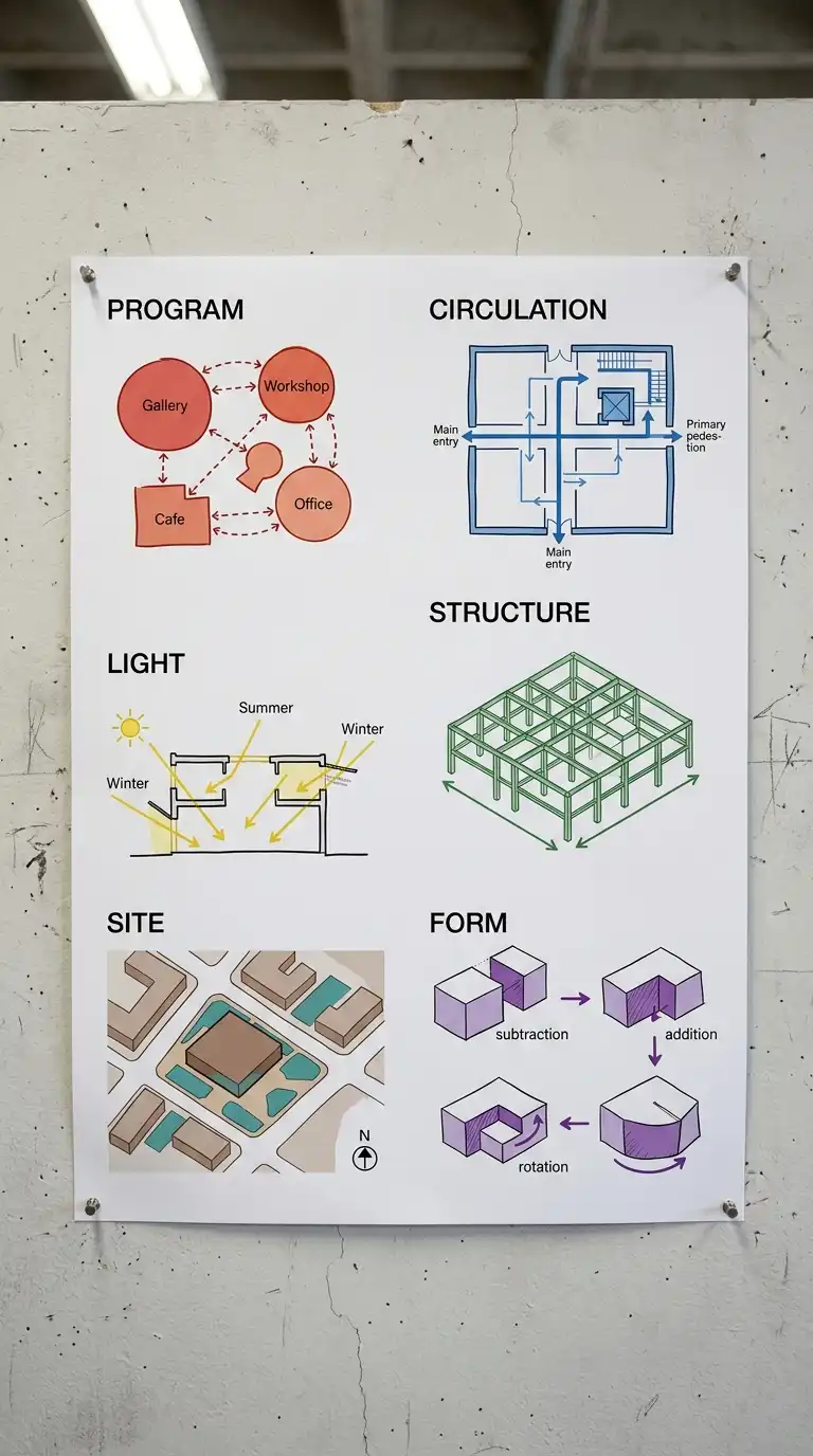 The diagrammatic analysis sheet uses abstract diagrams to explain the building’s concepts. No realistic drawings. Only diagrams. Program, circulation, structure, light, and site are each a diagram. The diagrammatic analysis sheet is abstract, conceptual, and graphic.