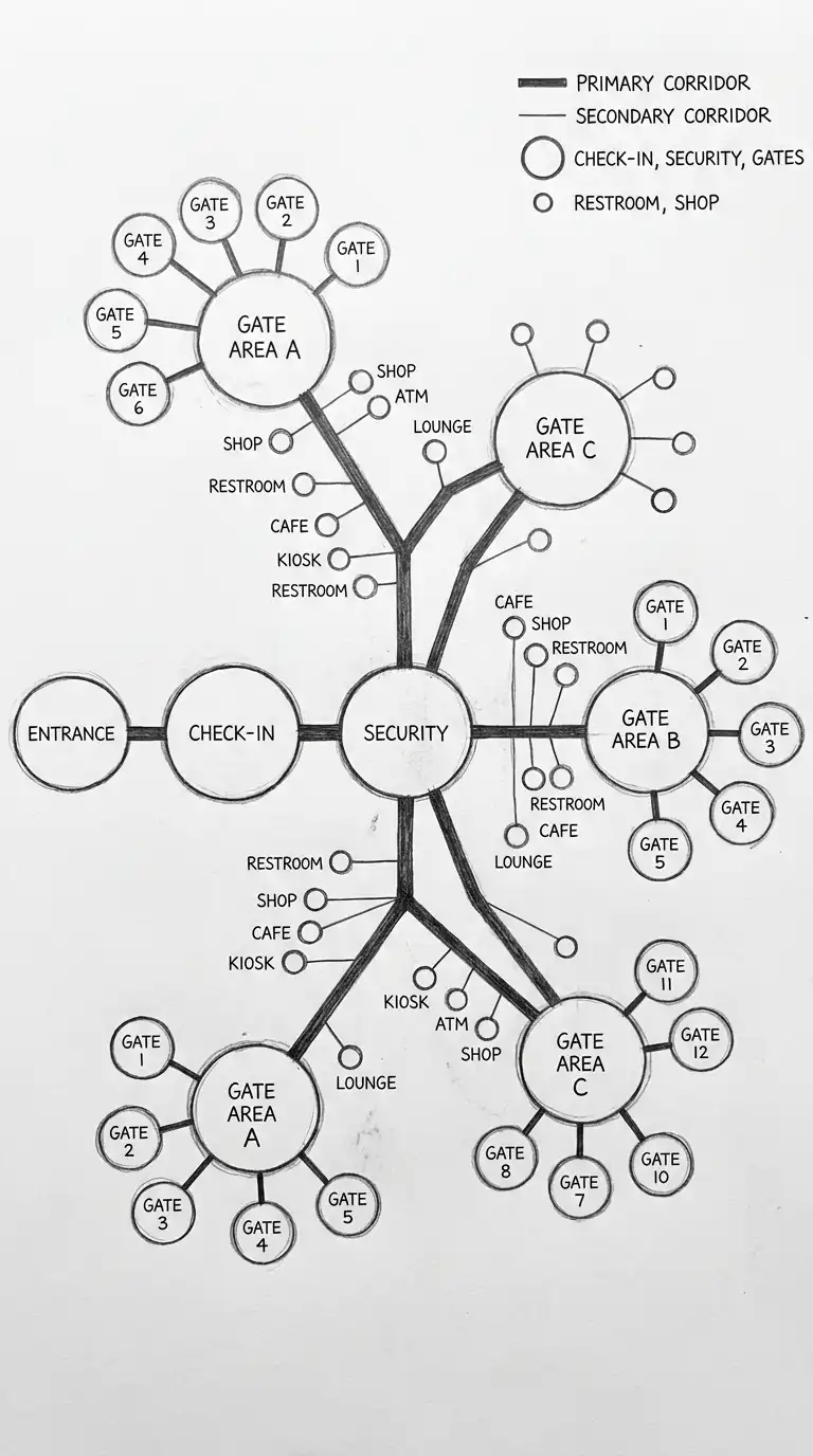 This diagram is ideal for showing circulation in buildings, airports, and train stations. The emotional effect is directional, flow-oriented, and clear.