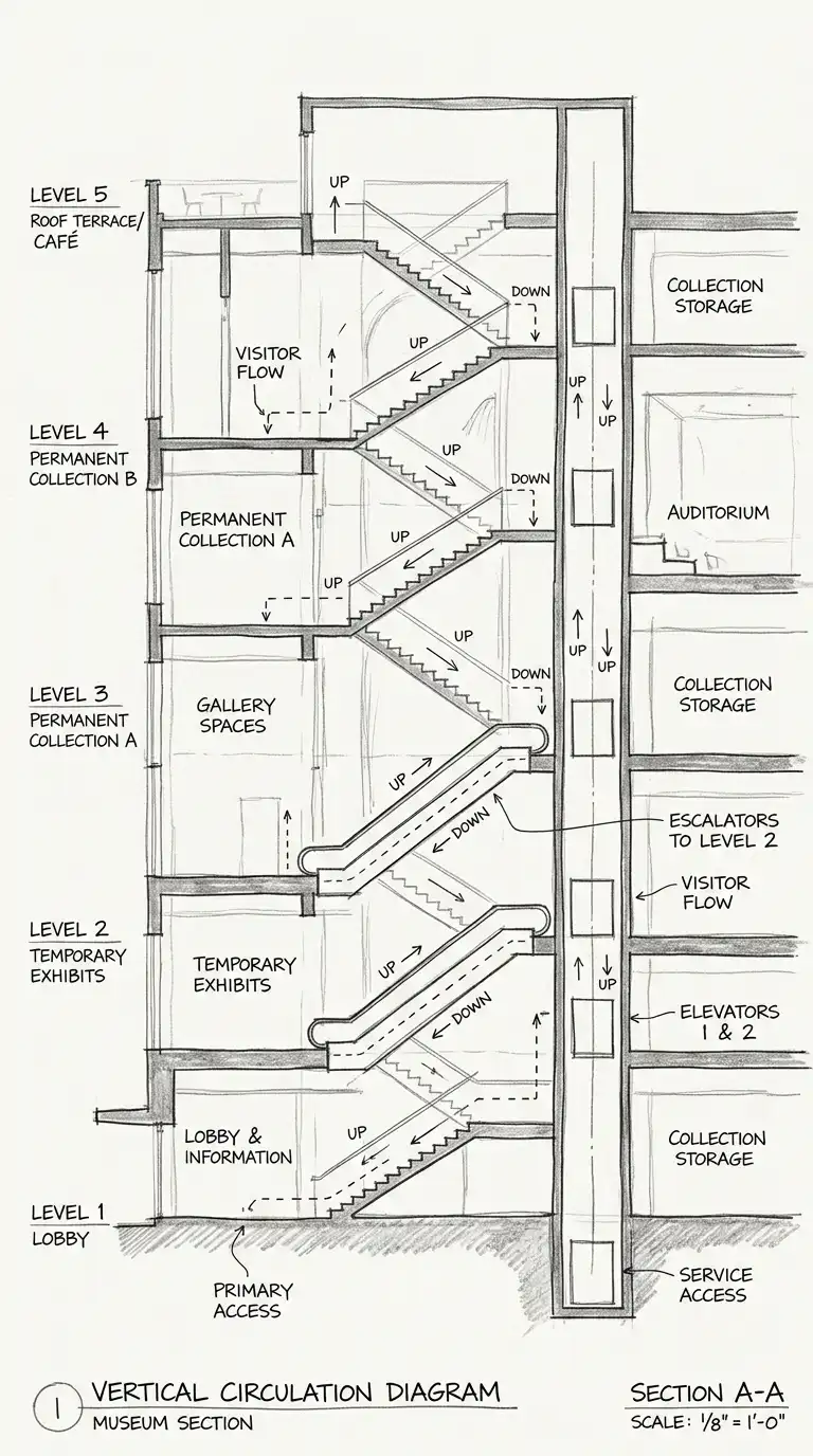 The vertical circulation diagram shows movement between floors. The diagram is a section or an axonometric. Stairs, elevators, escalators, and ramps are shown. Arrows show direction (up and down). The vertical circulation diagram is ideal for multi-storey buildings.
