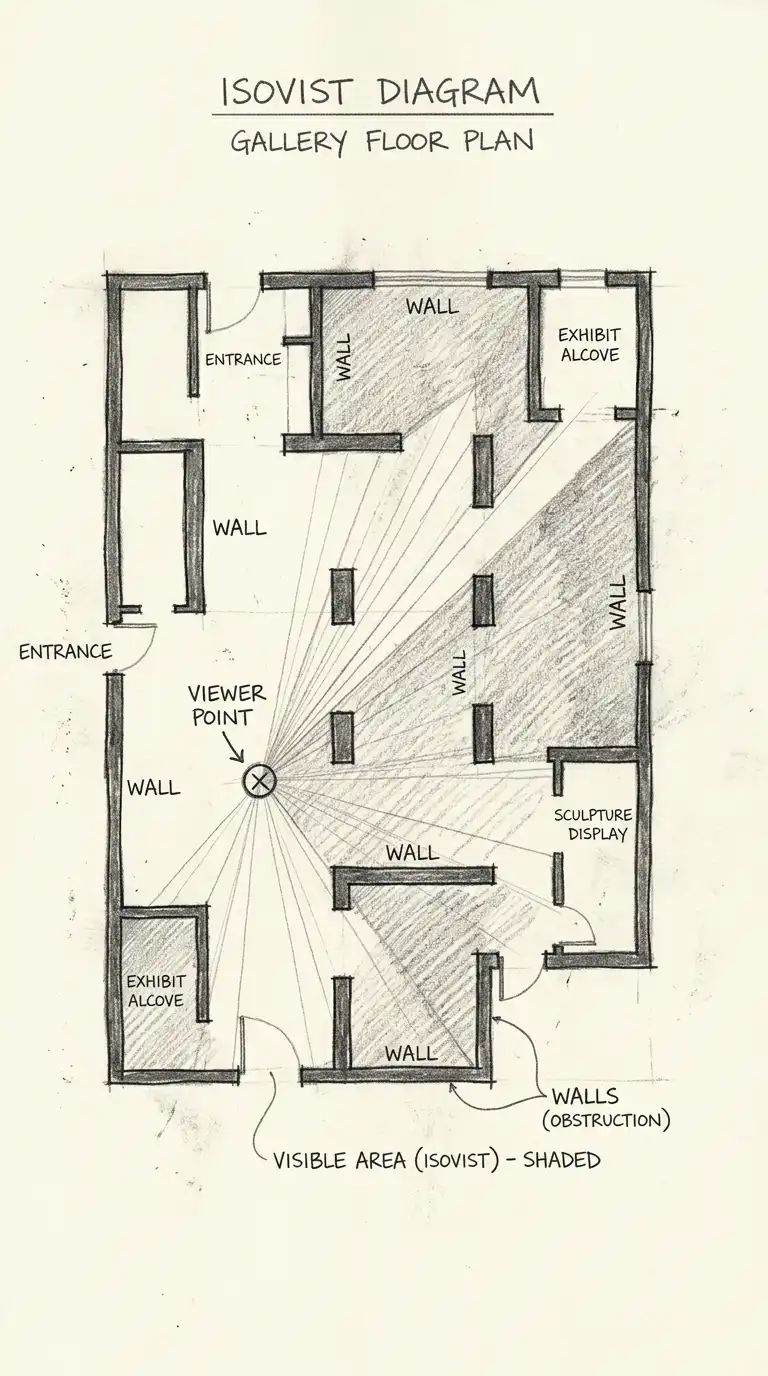 This diagram is ideal for museums, galleries, and security studies. The emotional effect is visible, viewable, and isovist.