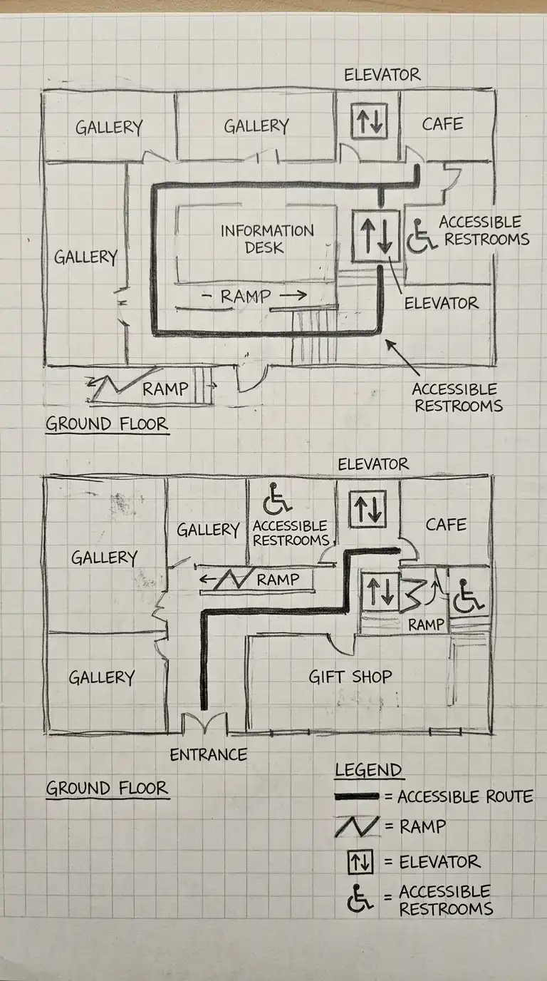 The accessibility diagram shows accessible routes for wheelchairs. The diagram shows ramps, elevators, wide doors, and accessible restrooms. The accessibility diagram is required for building codes and ADA compliance.