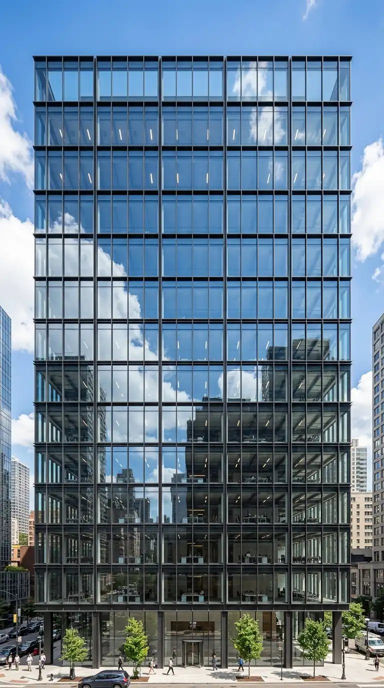 The curtain wall is a non-structural glass facade hung from the building’s frame. It does not hold up the building — it only keeps the weather out. This allows for uninterrupted glass surfaces, ribbon windows, and complete visual transparency.