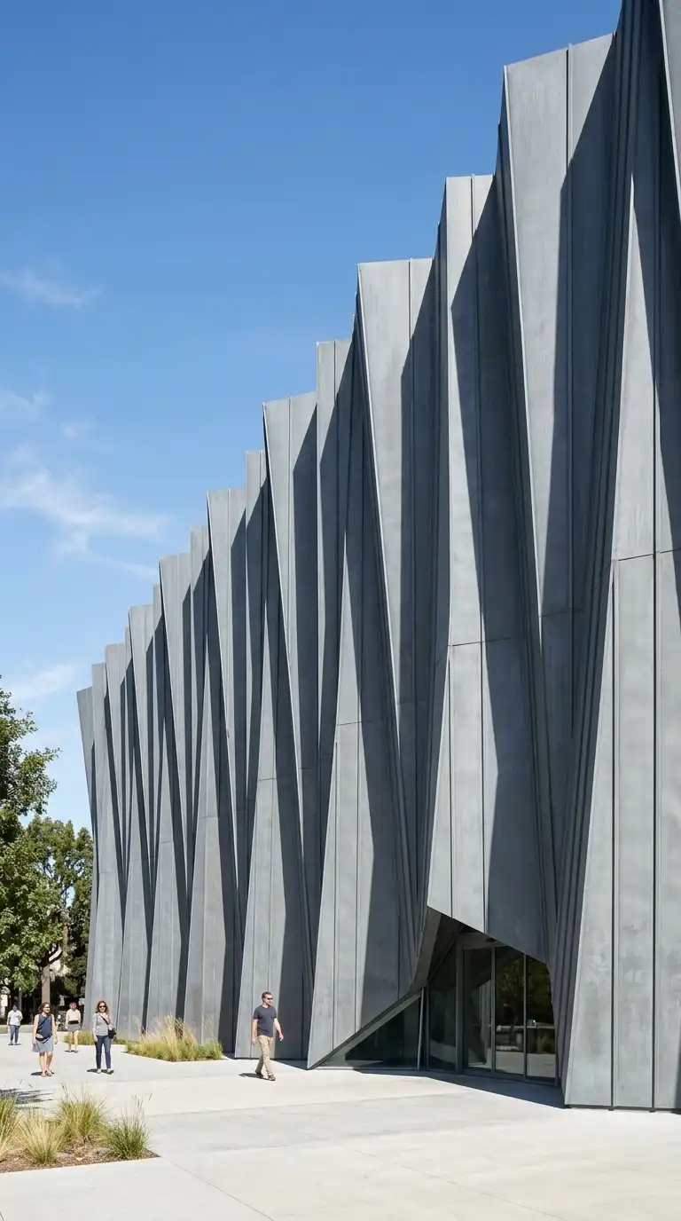 The folding facade is a single continuous surface that folds in and out, creating a three-dimensional pattern of light and shadow. The folds can be horizontal, vertical, or diagonal. They can be shallow or deep, regular or irregular.