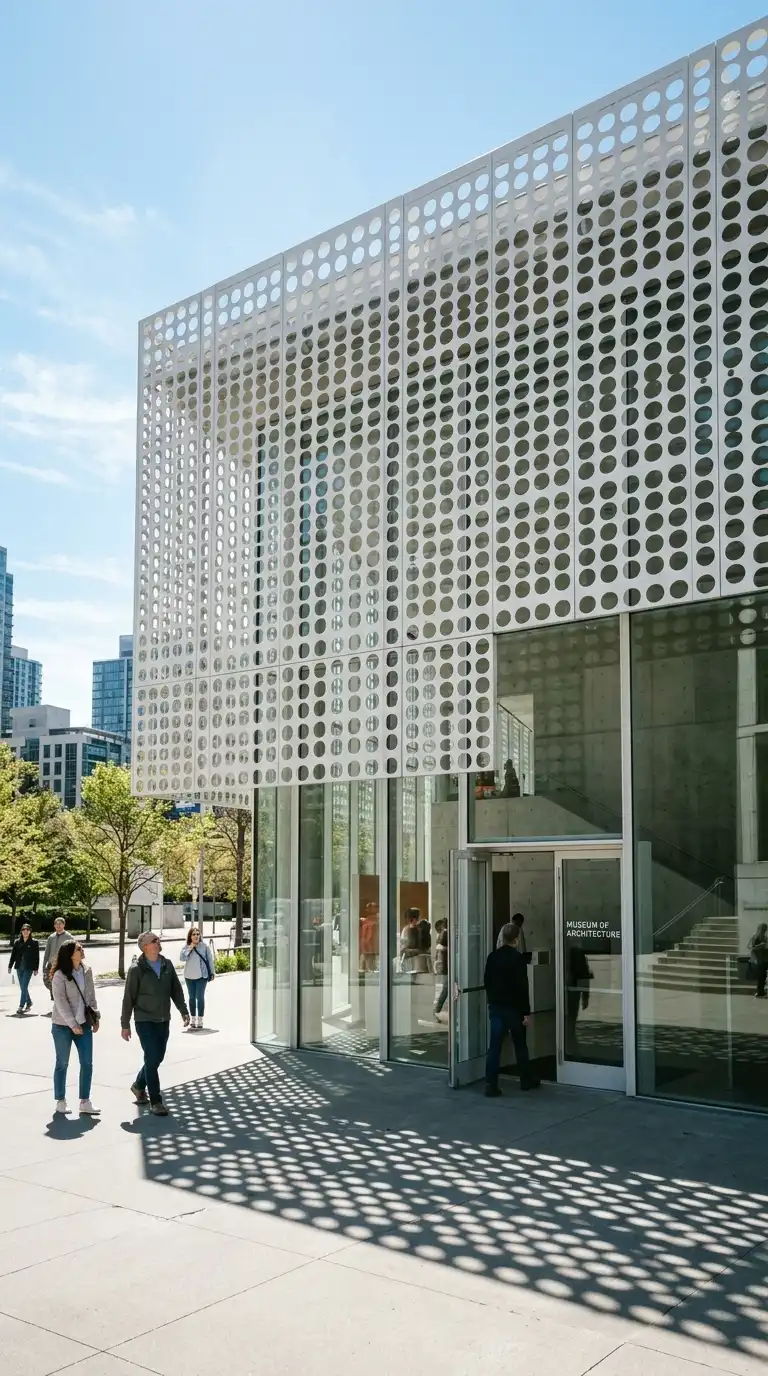The perforated metal screen is a modern facade that provides shade, privacy, and visual interest while allowing air and filtered light to pass through. Metal panels are punched with patterns — circles, squares, slots, custom designs — and mounted in front of the building.