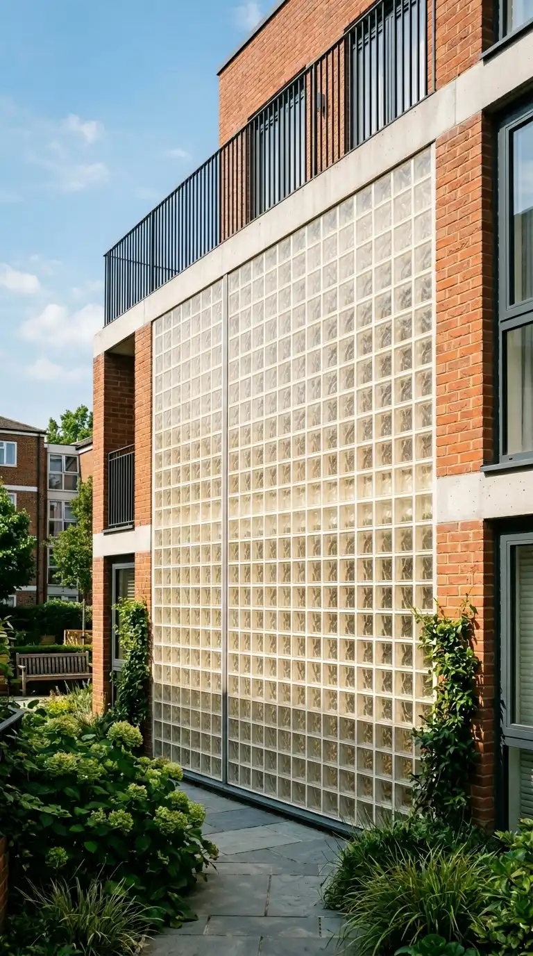 Glass block facades are ideal for privacy without sacrificing daylight. The emotional effect is luminous, textured, and slightly retro.