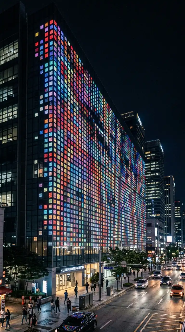 This facade type is interactive and dynamic. Pixels can change colour, open and close, or display data. The emotional effect is digital, playful, and technologically advanced.
