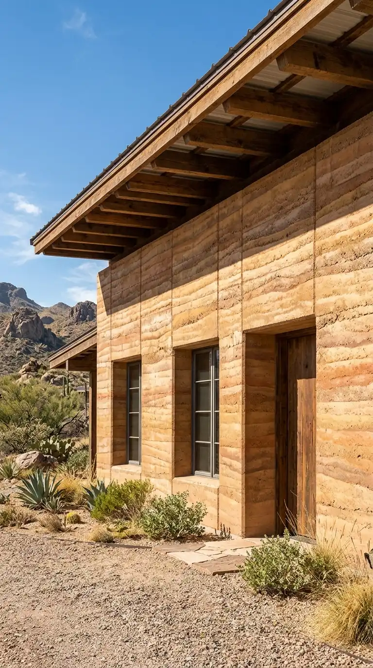 Rammed earth is an ancient construction technique revived in contemporary architecture. Soil is mixed with a small percentage of cement, then compacted in forms in layers. The result is a solid, monolithic wall with visible horizontal strata.